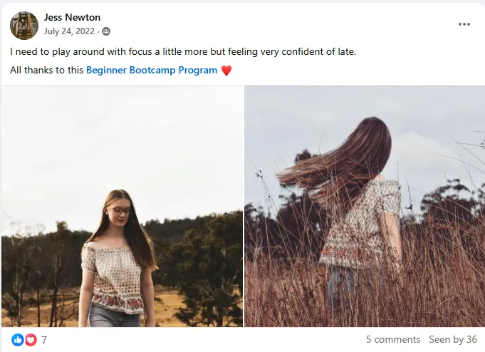 Having previously done a couple of photography courses I would highly recommend Beginner BootCamp. Clear, easy to follow instruction and workbooks without introducing all the dials and tech straight up. Plenty of practice in workbooks and feedback through the Facebook group. I can see the improvement in my images after just 21 days and am excited to continue improving with more practice.