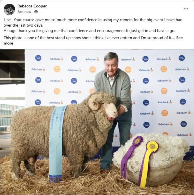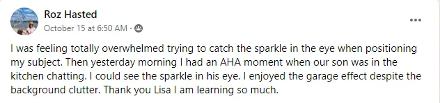 The zoom meetings were great an being able to ask questions even though you think they may be silly or whatever they weren’t and Lisa answered them so well an took her time to make sure I got the aha moment. And being able to send photos in and get feed back on them helped so much getting to know things I could do differently to get the best out of the picture."