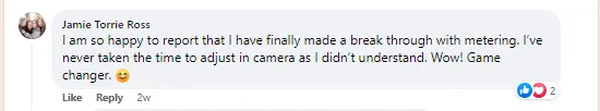 "I found Lisa extremely helpful and knowledgeable, and this course is so easy to work in around your life. I started this course as a real beginner behind my camera and totally relying on shooting in Auto with no knowledge of what any buttons or settings on my camera meant.