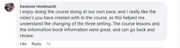 I found having the three layers of learning material very handy. The videos supported by the transcripts, the worksheets and then the Zoom sessions helped. Being a hands on learner I appreciated being able to print off the transcripts and take them with me. I could highlight the important things and put them in action. The instructor never ,made you feel inept or lagging when talking during Zoom. Lisa was very supportive. Also thanks to admin.